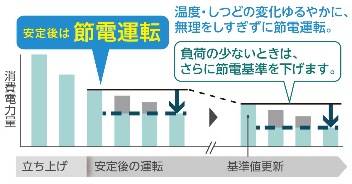 室内が設定湿度・しつどに到達し安定すると、消費電力を抑えて運転します。